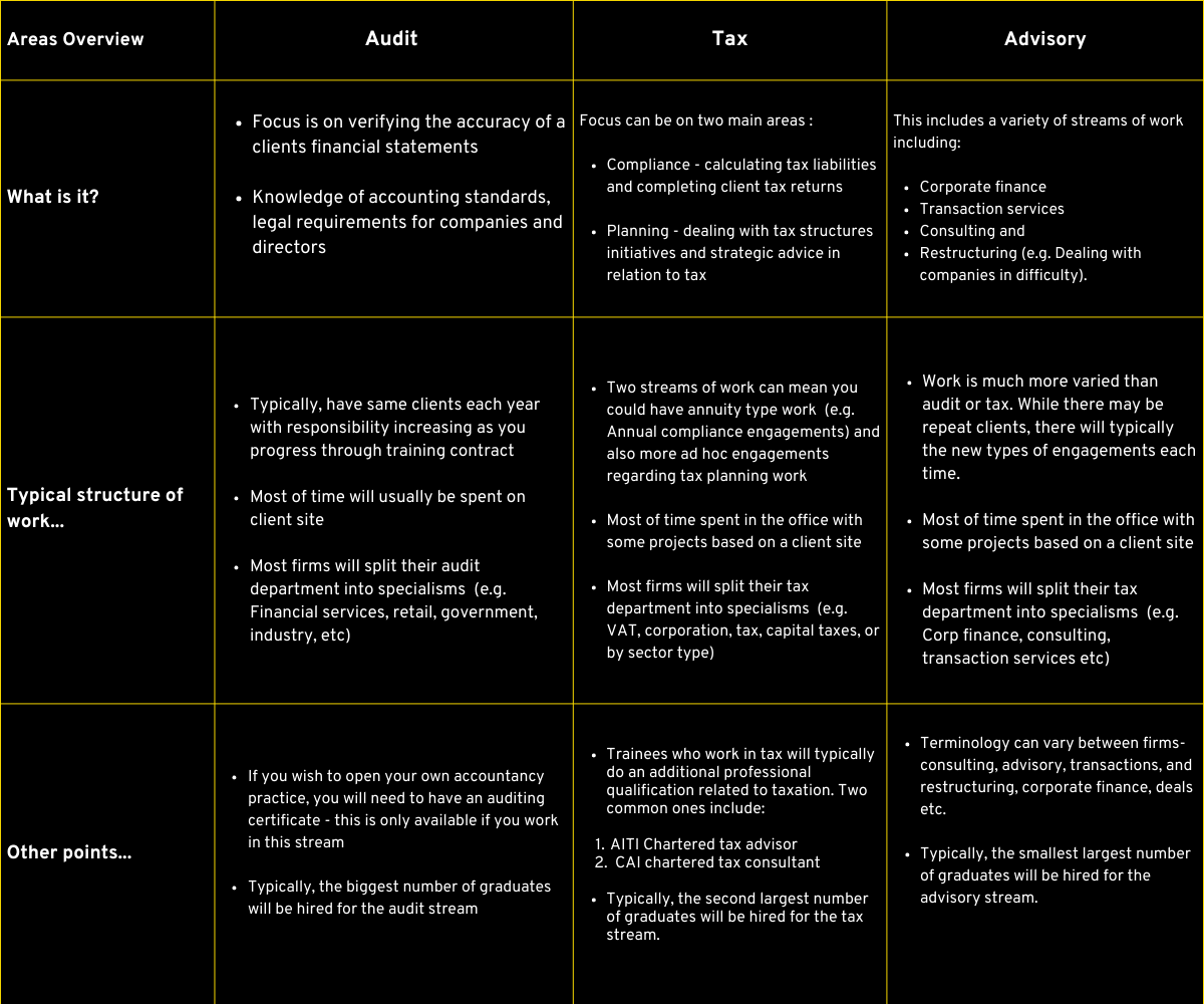 Below, we discuss some key factors to consider when deciding on what area you would like to train in. We also provide a summary of audit, tax and advisory.